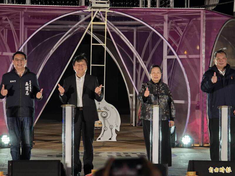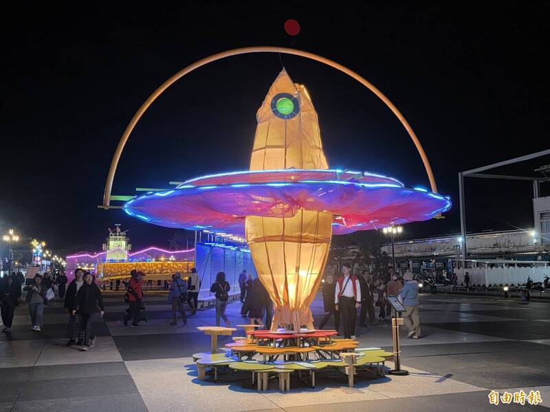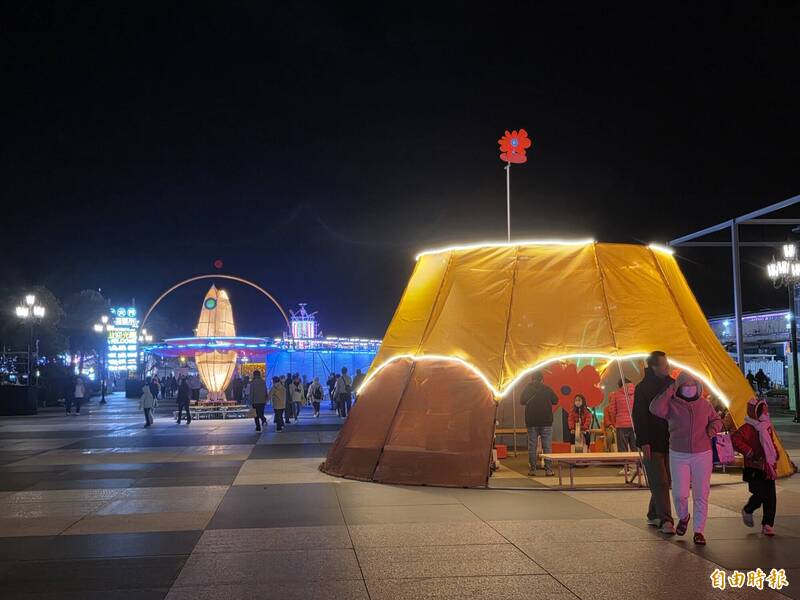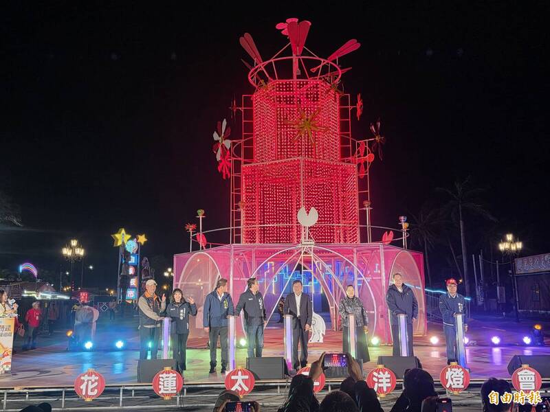 太平洋燈會主燈「花現騎蹟」,像個蛋糕形狀寶塔。(記者花孟璟攝)