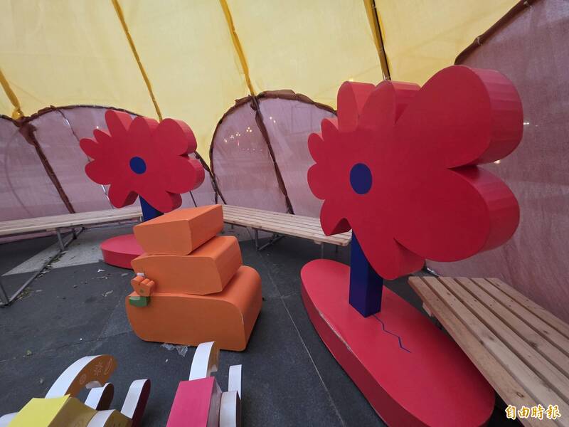 使用鋁管搭的主燈造景等,民眾逛逛後覺得乏善可陳。(記者花孟璟攝)