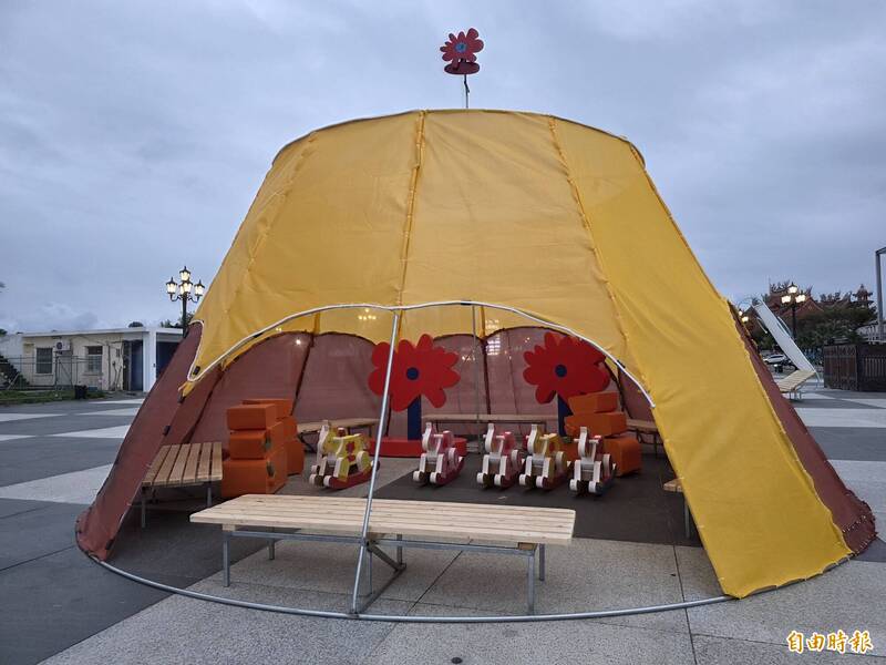 作品之一「慢下來」,外觀的金屬鋁管搭配山脈形狀的布幔,看上去只有滿滿的粗糙感。(記者花孟璟攝)