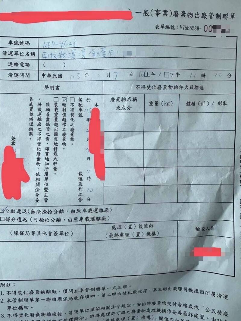 退運單上勾選輻射值超標項目。(埔里鎮清潔隊提供)