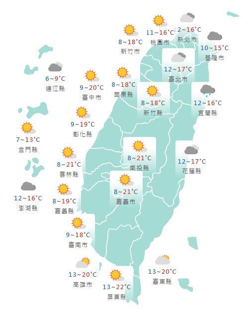 週二(10日)各地氣溫回升,但早晚仍偏冷,中南部日夜溫差大,各地大多為多雲到晴,僅東半部地區及恆春半島有零星短暫雨。低溫預測方面,西半部、宜花及澎湖12至15度,台東16度,金門11度,馬祖9度;高溫方面北部22度,中部及東半部22至24度,南部26度,澎湖及金門18度,馬祖14度。