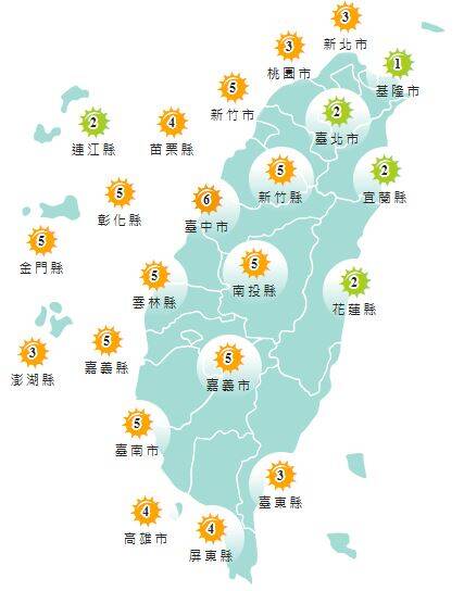 今日各地紫外線指數預報概況。(圖擷取自中央氣象署)