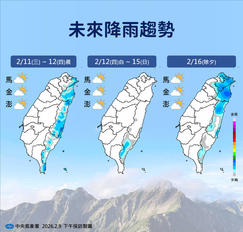 曾昭誠表示,除夕(下週一)鋒面通過、東北季風增強,預估這波冷空氣會影響到初三,北部、宜蘭氣溫會先稍微下降,除夕白天溫度降至20度左右。桃園以北、東北部及東部地區有局部短暫雨,東南部地區及北部山區有零星短暫雨,其他地區為多雲到晴。