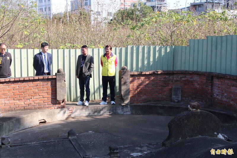苗栗縣長鍾東錦(右2)參觀廟方後方的縣定古蹟「苗栗義塚」,看到周邊被地主以圍籬圍住,認為影響視線及出入,將要求地主拆除。(記者張勳騰攝)