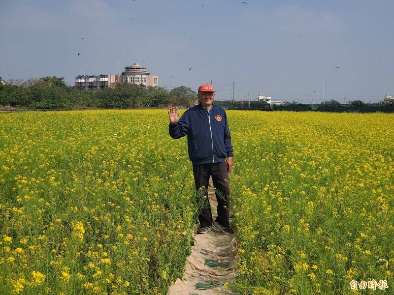 二崙鄉73歲老農廖而長為返鄉過年鄉親留下的油菜花田。(記者黃淑莉攝)