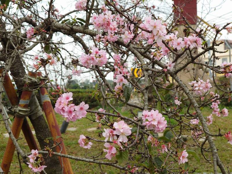 園區滿是紅色系列的櫻花,充滿過年喜氣。(米諾斯提供)