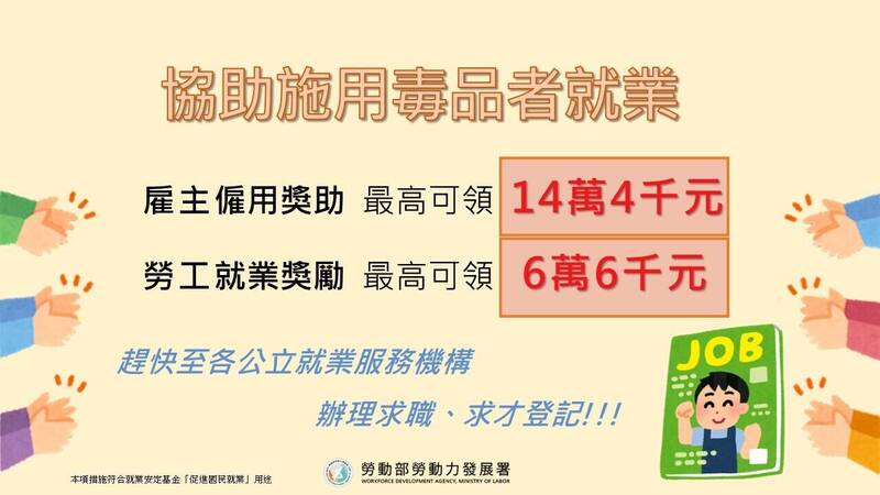 勞動部積極推動「施用毒品者就業服務計畫」,透過就業服務員提供職涯探索、就業前準備、陪同面試、開發友善廠商等多項服務措施,符合該計畫資格之求職者,每個月可以領取5000元或6000元不等的獎勵金,最長可以領取12個月;另外,為了鼓勵雇主提供友善的就業機會,僱用經公立就業服務機構推介的施用毒品者滿10天,即可申領津貼,累計最高可申領14萬4000元。民眾可洽詢高屏澎東分署各地就業中心。