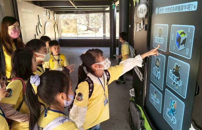 小朋友在犀牛廊道體驗「犀牛魔鏡」。(壽山動物園提供)