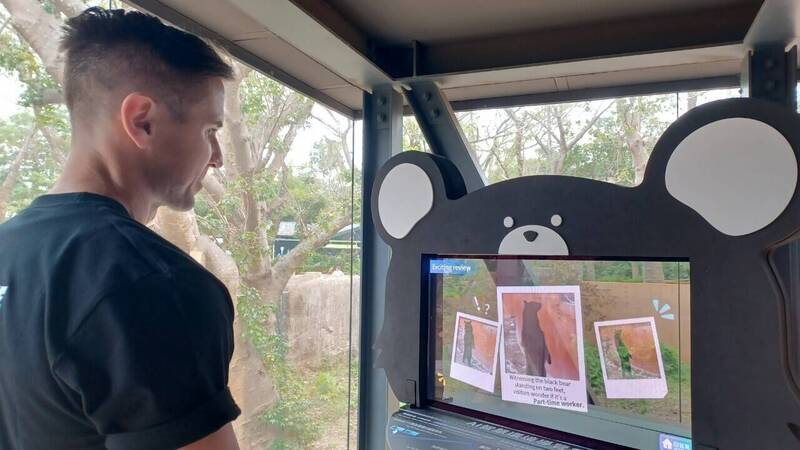 外國遊客於黑熊廊道體驗「AI智慧環境導覽系統」。(壽山動物園提供)
