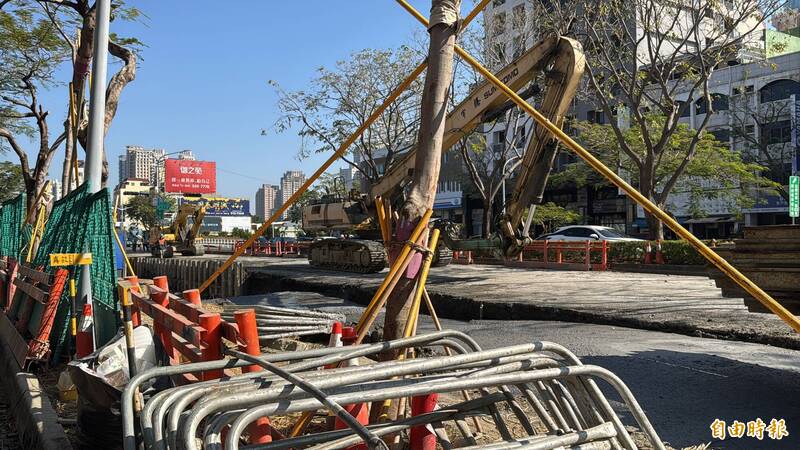 中華二路近遼北街口的慢車道地層下陷,目前已進行補強。(記者許麗娟攝)