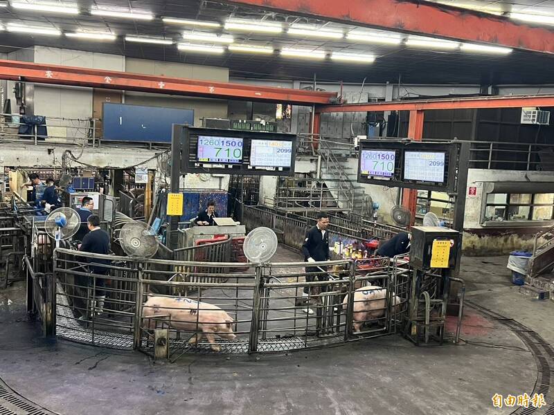 雲林肉品市場毛豬拍賣,量價平穩。(記者黃淑莉攝)