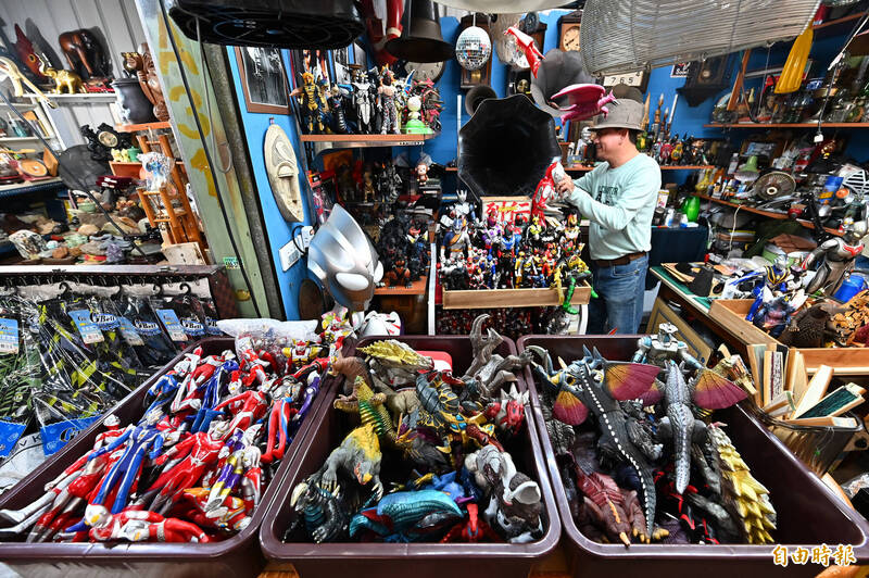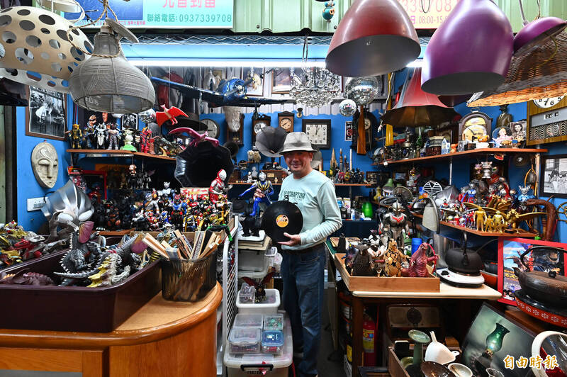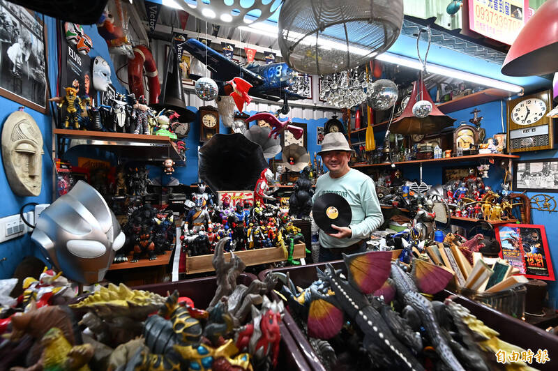 「光音到留」老闆王錫祥喜愛收藏日本「奧特曼」和哥吉拉的公仔,本身也是留聲機維修師。(記者李惠洲攝)