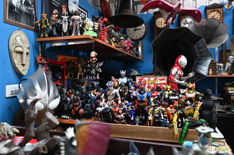 王老闆收藏的「奧特曼」和哥吉拉系列公仔。(記者李惠洲攝)