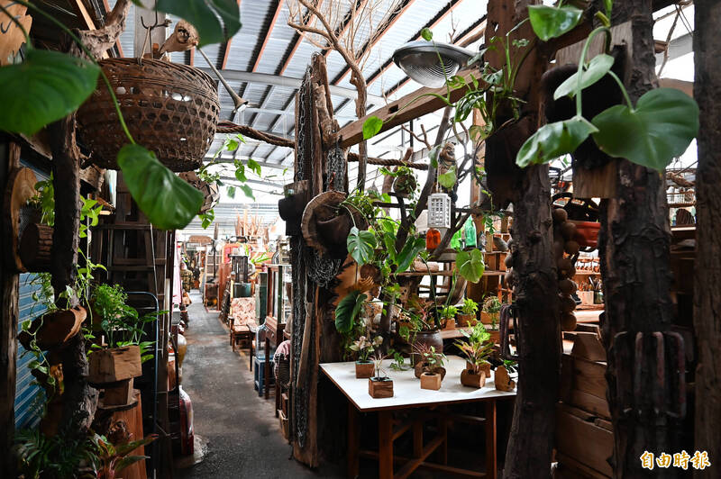 內惟跳蚤市場不只賣商品,就連廢棄木頭都有攤商創作利用設計成植物擺飾。(記者李惠洲攝)