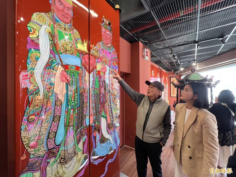 人間國寶彩繪大師洪平順向雲林縣副縣長陳璧君說明新創作的朝天宮門神。(記者黃淑莉攝)
