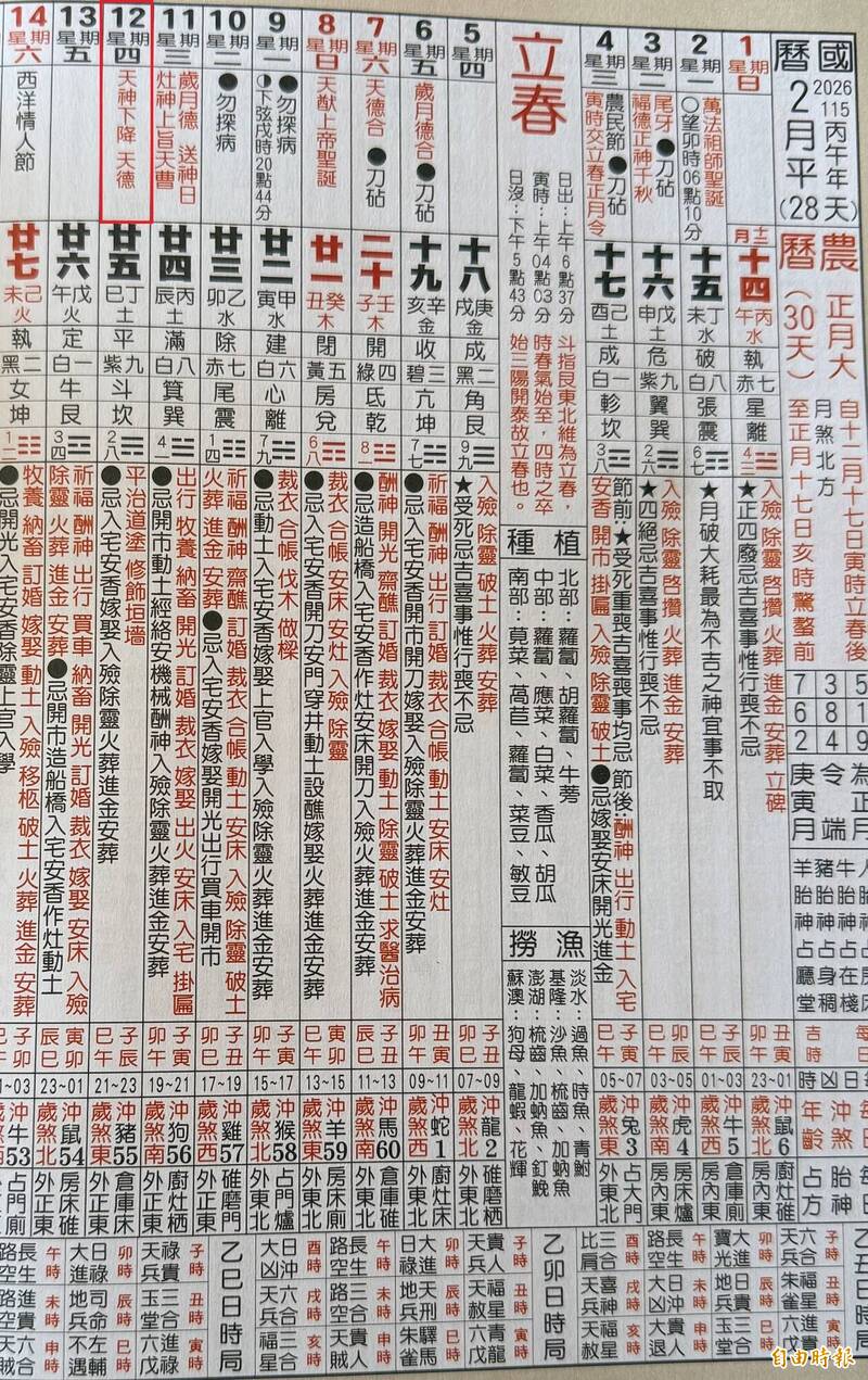 今天農曆12月25日,農民曆標注「天神下降」。(記者陳鳳麗攝)