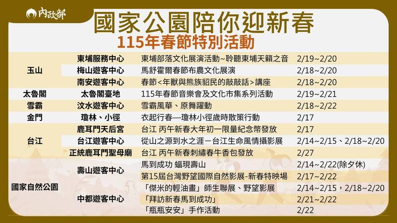 農曆春節將至,內政部今天公布「國家公園陪你迎新春—115年春節特別活動」系列內容,整合玉山、太魯閣、雪霸、金門、台江及國家自然公園等資源,自2月14日至2月27日陸續推出音樂會、文化展演、市集、講座、攝影展及手作體驗等多元活動,邀請民眾春節走春踏青,感受國家公園自然與人文之美。