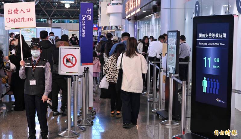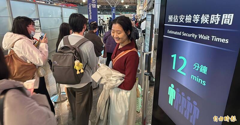 隨著春節年假腳步接近,桃園國際機場清晨湧現大批出國人潮,第一、二航廈出境大廳報到櫃檯前排起長長人龍,航空公司與地勤人員加快作業節奏,為春節疏運揭開序幕,桃機並新增設「預估通關時間」電子看板,讓旅客可預期安檢等候時間。
