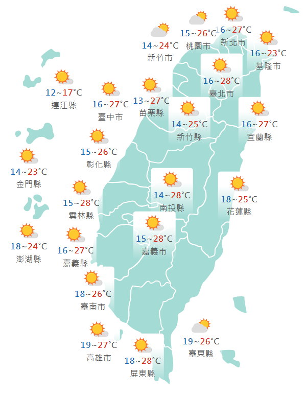 | 各地體感溫度預報 (°C) | 北部 | 中部 | 南部 | 東部 |