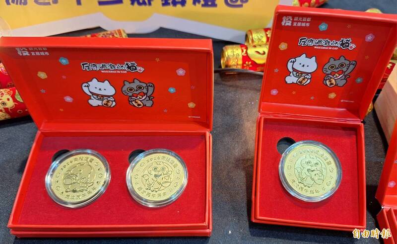 南投燈會推出人氣IP「反應過激的貓」紀念套幣。(記者張協昇攝)