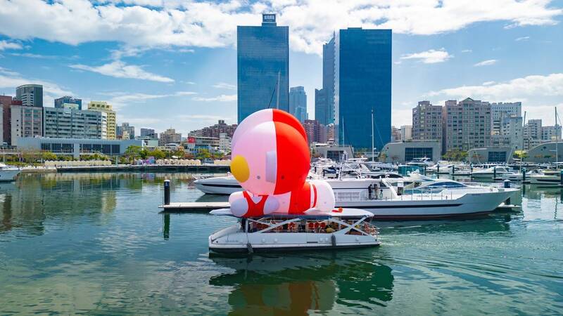 8米高「Q版初代超人力霸王」氣膜,今搭乘愛之船在愛河灣首次充氣亮相。(高雄市觀光局提供)
