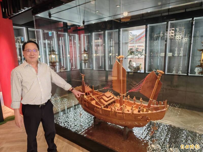張鈴宏說,1樓則是6米的挑高空間,展示較為大型的宗教祭典器物,包含遶境的神轎、娘傘,以及各式旗幟,還有彩繪王船模型、七星平安橋,加上獲台南市政府登錄傳統工藝「糊紙」保存者吳文進的12生肖作品。