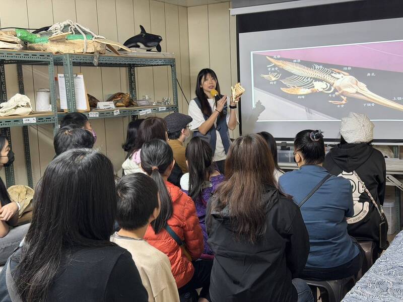 新北市政府動物保護防疫處舉辦「鯨豚海龜保育教育分享會」,中華鯨豚協會專員介紹鯨豚生理構造。(新北市動保處提供)