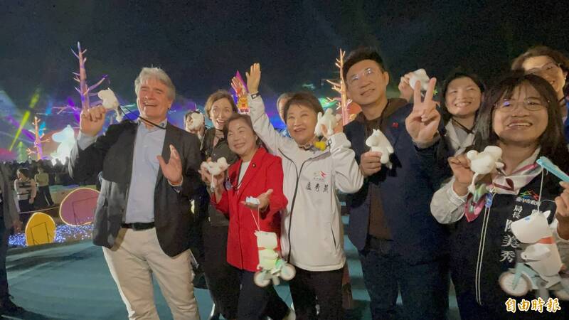 台中市長盧秀燕今晚與荷蘭在台辦事處代表浦樂施、加拿大駐台北貿易辦事處代表何曼麗一起點燈,宣告中台灣燈會開幕。