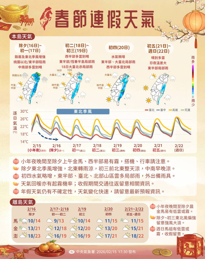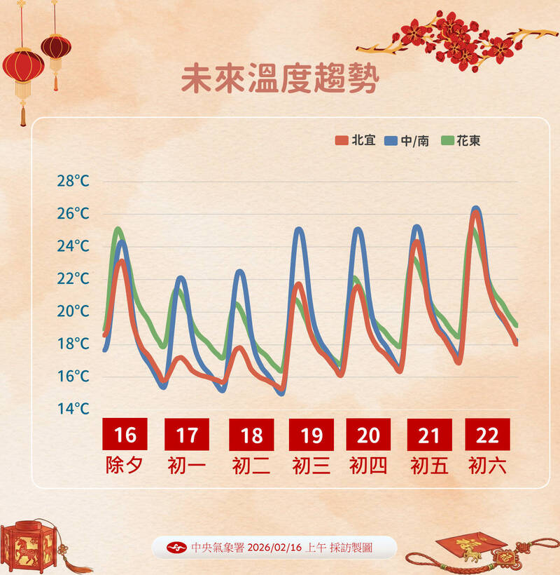 「初三開始會慢慢回溫且轉為較乾的天氣型態。」賴欣國說,初三東北季風逐漸減弱,北部及東北部氣溫稍回升,各地早晚仍涼;各地大多為多雲到晴,東部、東南部地區及恆春半島有局部短暫雨,東北部有零星短暫雨。