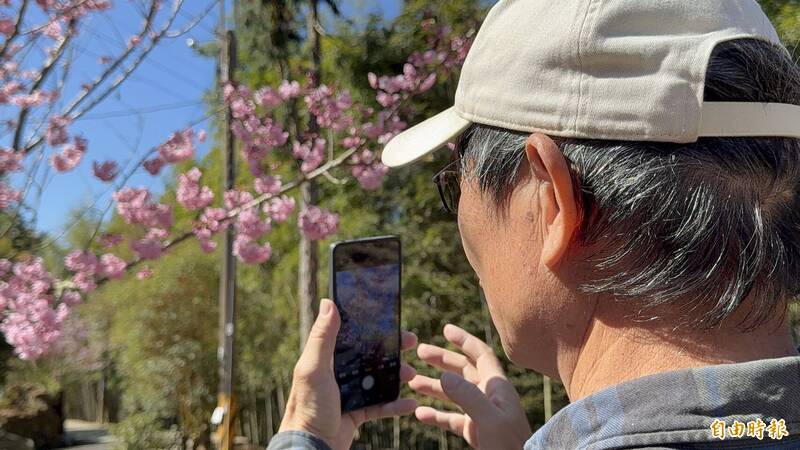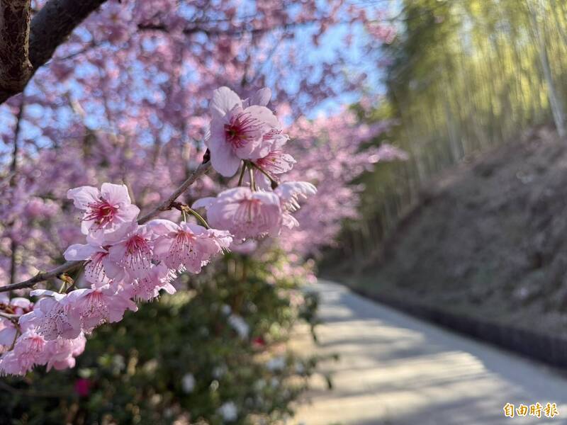 粉紅色櫻花綻放,讓人看了心曠神怡。(記者李文德攝)