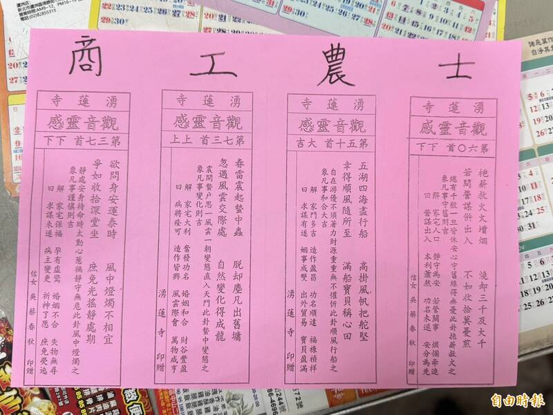 新北市蘆洲區湧蓮寺除夕(16日)抽出俗稱「公籤」的國運籤,士、農、工、商分別抽到「下下」、「大吉」、「上上」、「下下」籤。