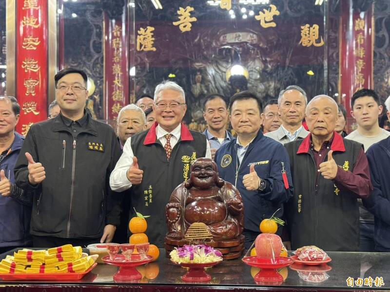 湧蓮寺主委陳宏昌(中)深夜約11點15分率全體工作人員舉行新春團拜。(記者羅國嘉攝)