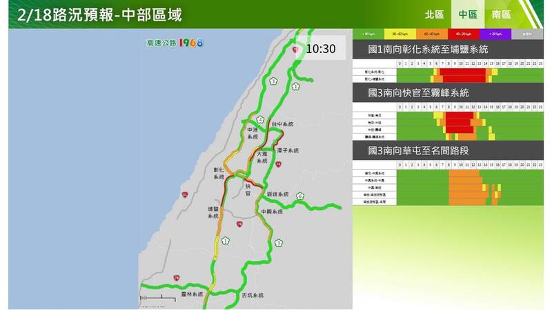 明天(18日)大年初二,交通部高速公路局今天晚間說明,明天有18處路段容易塞車,並提醒將開始高乘載管制、匝道封閉措施,建議西部國道南向用路人儘量6時前或12時後出發;國5南向用路人5時前或17時後出發;國5北向用路人則建議9時前出發。