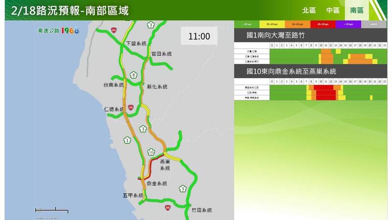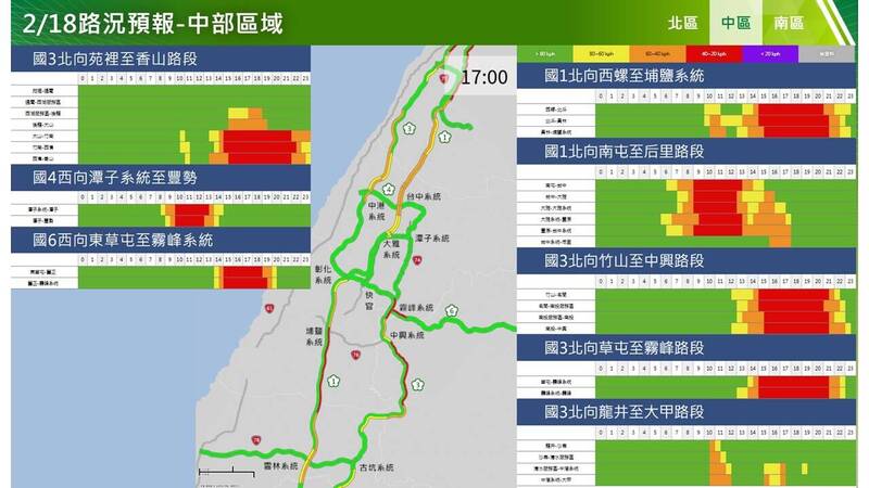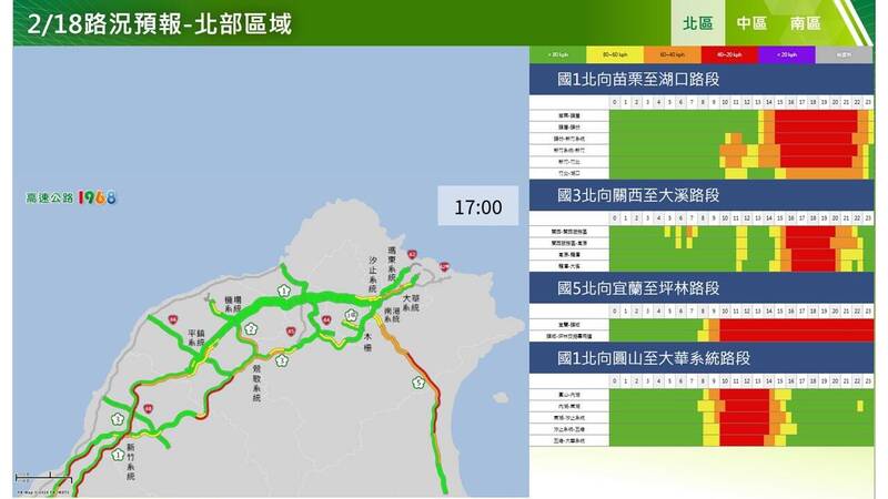 明日初二,高公局預估國道交通量為134百萬車公里,為平日年平均的1.4倍,其中南向交通量可達69百萬車公里,是平日年平均的1.5倍。高公局預判明日重點壅塞路段共18處。