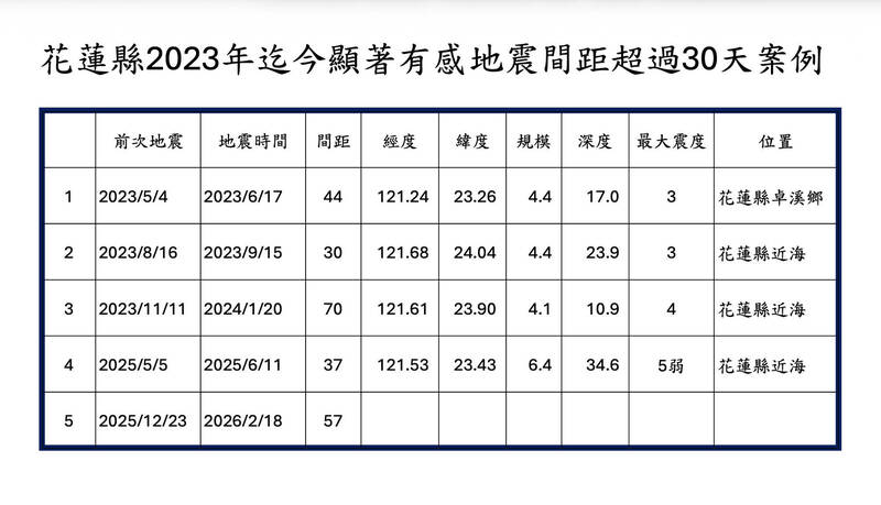 花蓮縣2023年迄今顯著有感地震間距超過30天案例。(圖由郭鎧紋提供)