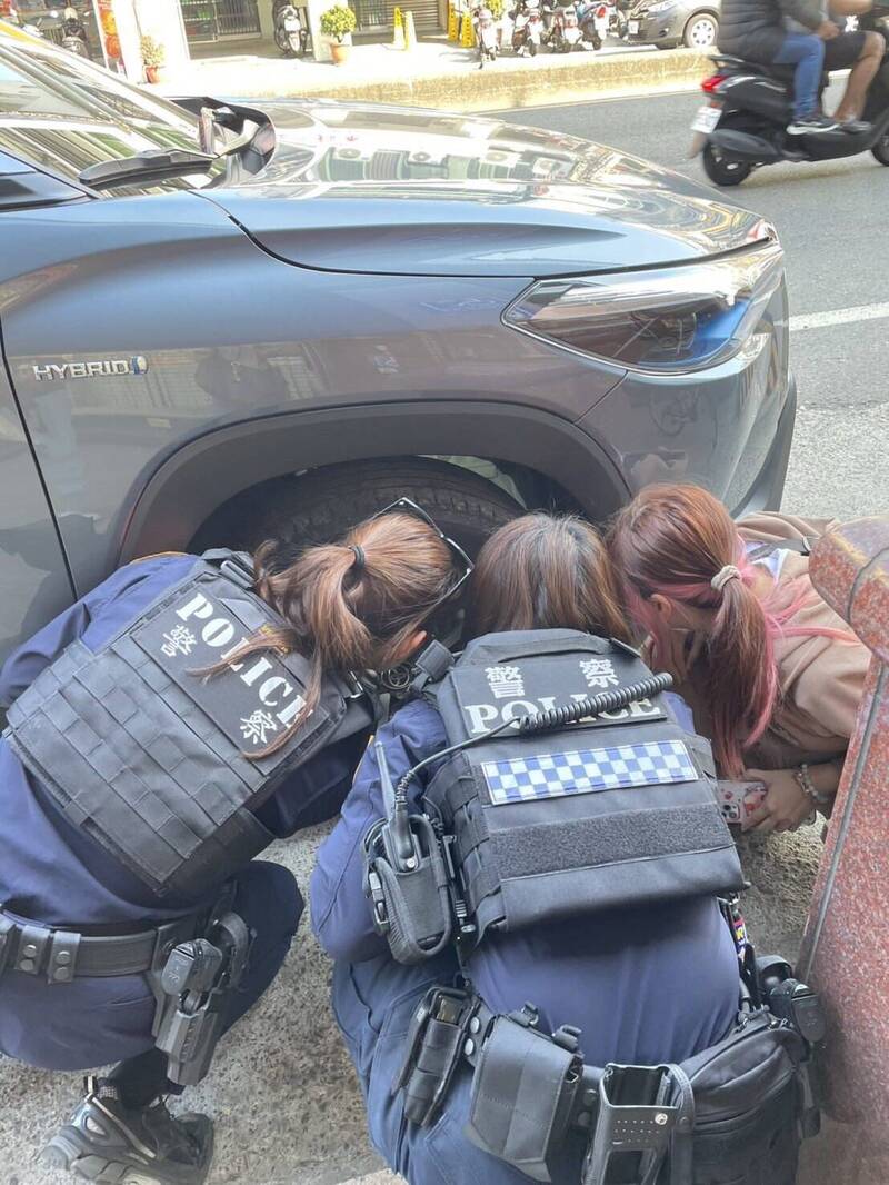 員警和熱心車主成功救出受困車底的小貓。(民眾提供)