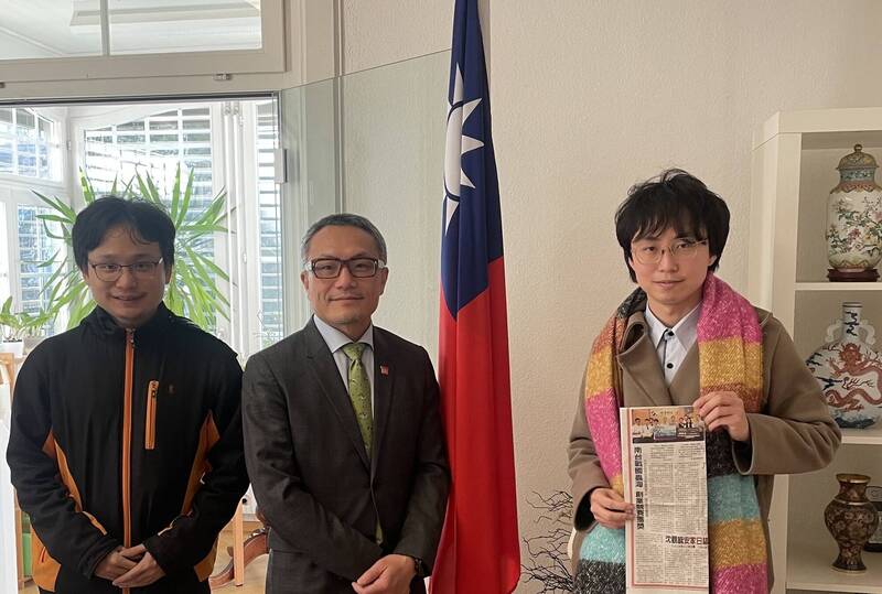 林韋成(右)及團隊成員林暐欽(左)拜會中華民國駐瑞士台北文化經濟代表團,與駐外代表王思為(中)合照。(圖由南市研考會提供)