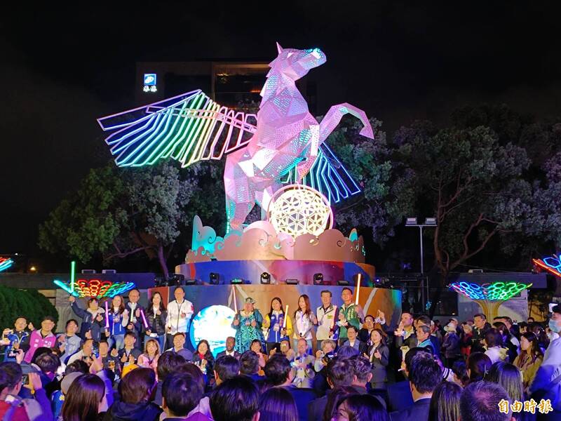桃園燈會全台首座機械動態飛馬主燈25日點燈,燈光秀讓現場民眾驚呼連連。(記者鄭淑婷攝)