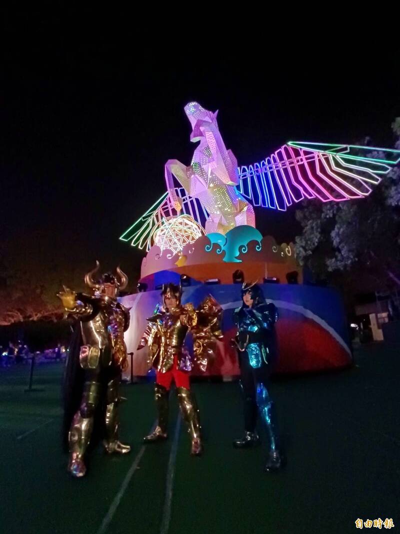桃園燈會13米飛馬主燈點燈,首日有Cosplayer 以聖鬥士星矢造型現身,在閃亮的飛馬主燈下,吸引民眾搶拍、合照。(記者鄭淑婷攝)