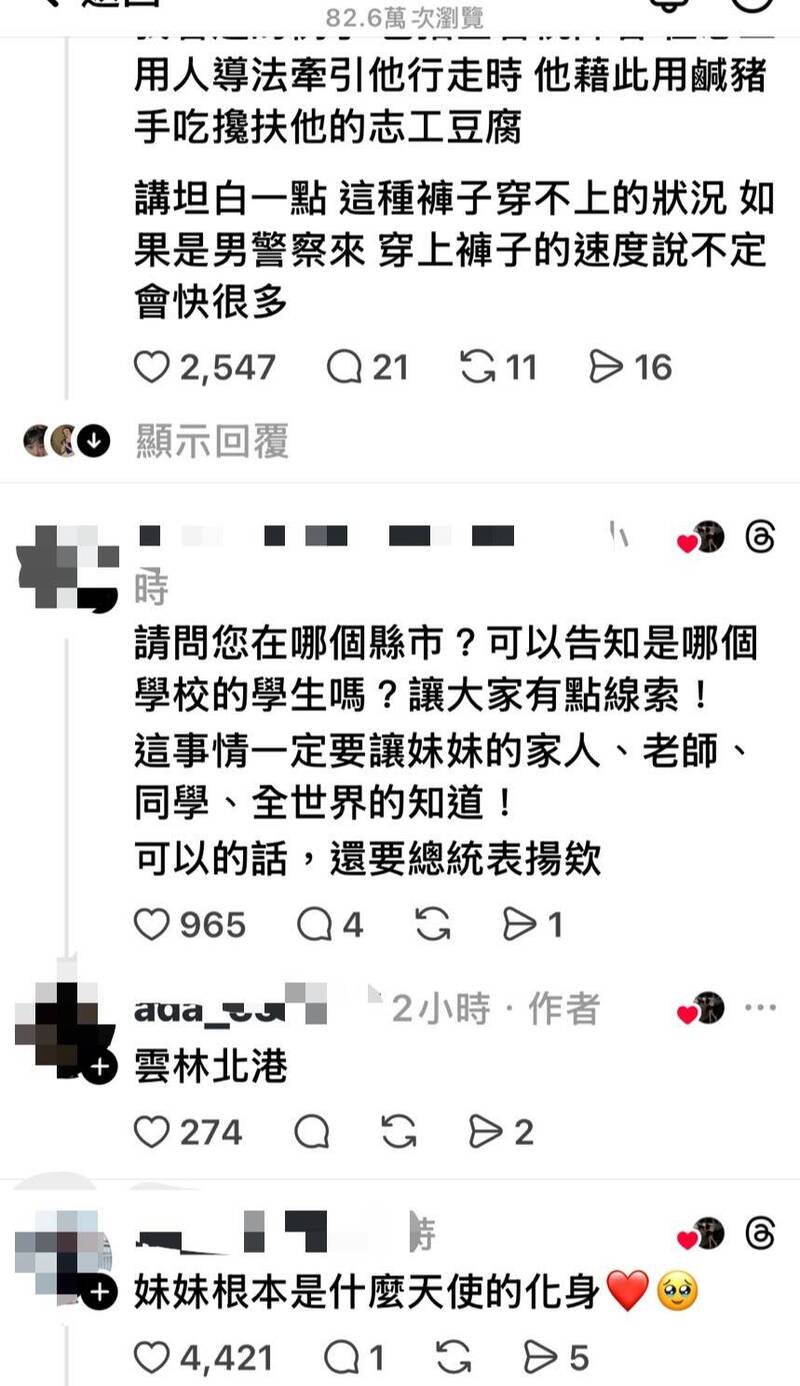 有民眾今(25)日下午4、5點行經北港時,目睹有個疑似失智男子褲子掉了不自覺,連鞋子都掉了,此時一名穿著學校制服的女同學停下腳踏車上前幫忙穿好褲子。網友「ada_330627」將影片PO上Threads,3小時就吸引約90萬次瀏覽、超過4萬人按讚,許多人留言讚賞女學生根本是天使的化身、勇敢好棒,甚至有人主動要提供獎學金給她。