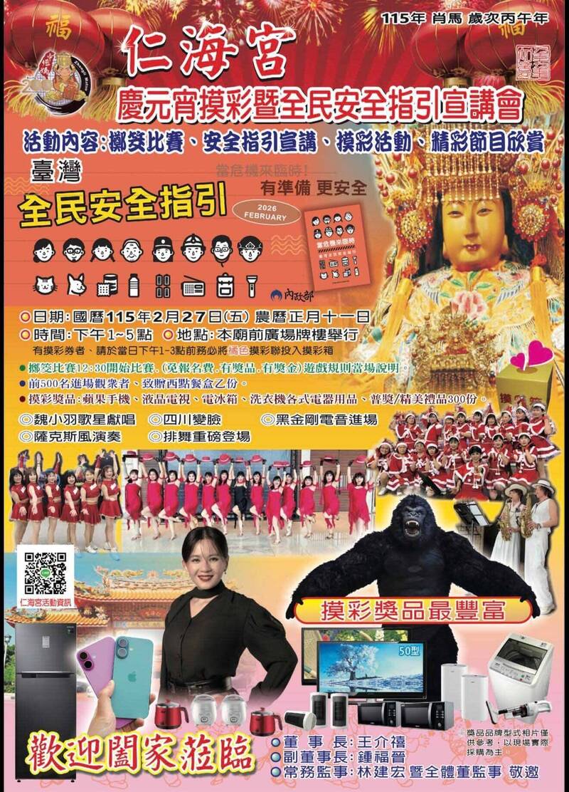 王介禧也預告,中壢仁海宮今年慶元宵摸彩大放送活動,響應國防部修訂發行《當危機來臨時:台灣全民安全指引》手冊(又稱「小橘書」),結合內政部於2月27日下午1點到5點在仁海宮廟前廣場牌樓辦理全民安全指引宣講會,邀請桃園市警察局長廖恆裕專題演講,還安排中壢媽主題曲主唱人魏小羽深情獻唱,黑金剛電音進場、四川變臉,以及薩克斯風與活力排舞演出;重頭戲是當天還有超狂摸彩抽大獎,獎品有蘋果手機、50吋電視、冰箱、洗衣機等家電等你抱回家!