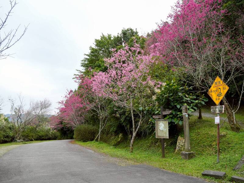 石碇二格山櫻綻放形成美麗櫻花夾道,增添明媚春色。(新北市綠美化環境景觀處提供)