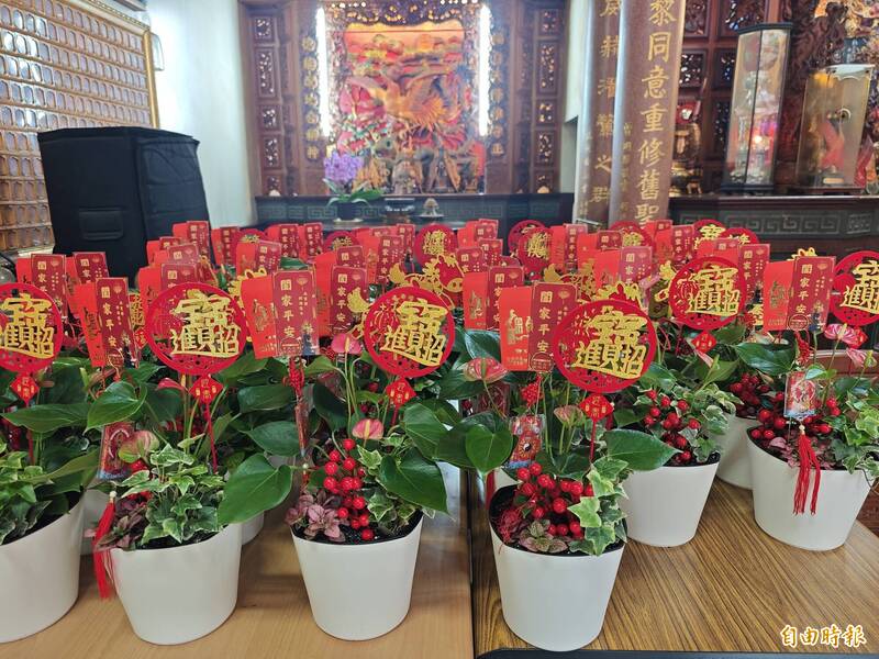 田尾公路花園內廟宇受武宮,獨創「擲花斗」儀式,只要擲出聖杯,就能獲得象徵平安與好運的精緻花斗。(記者陳冠備攝)