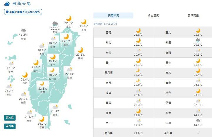 離島方面,澎湖多雲短暫陣雨,21至26度;金門多雲且短暫陣雨,17至21度;馬祖陰時多雲且短暫陣雨,13至15度。