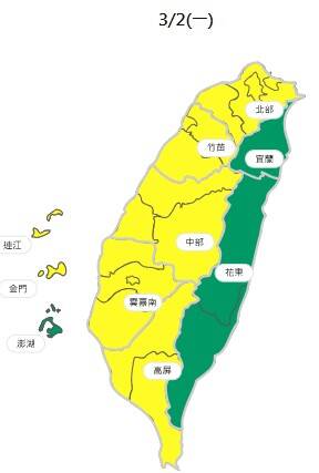 空氣品質方面,週一鋒面影響,環境風場為偏南風至西南風,雲嘉南以北擴散條件稍差,污染物稍易累積;中部以北地區及金門、馬祖易有低雲或局部霧影響能見度;宜蘭、花東空品區及澎湖為「良好」等級;北部、竹苗、中部、雲嘉南、高屏空品區及馬祖、金門為「普通」等級。