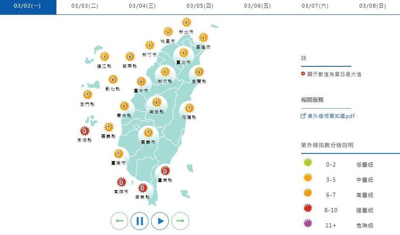 週一的紫外線指數,新北、台北、基隆、桃園、新竹、金門為「中量級」;苗栗、台中、南投、彰化、雲林、嘉義、宜蘭、花蓮、台南、金門為「高量級」;其餘的台東、屏東、高雄、澎湖則為「過量級」。(擷取自中央氣象署網站)