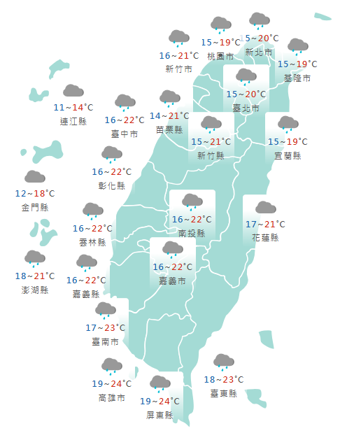 中央氣象署表示,今天(4日)東北季風影響,清晨中部以北及宜蘭低溫為14至16度,其他地區為17至19度,預估冷空氣強度接近大陸冷氣團,感受濕冷;白天高溫在中部以北及宜花為19至21度,南部及台東為23、24度,感受仍偏涼。
