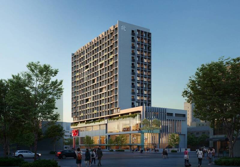 中壢新明市場將轉型市場共生社宅,規劃興建地下3層、地上16層建築,結合市場與社宅功能,圖為模擬圖。(住都處提供)
