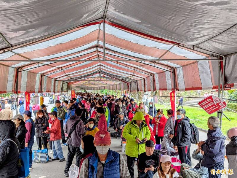 南投竹山紫南宮「吃丁酒」活動發放10萬份料理包,吸引2萬多人到場排隊朝聖。(記者劉濱銓攝)