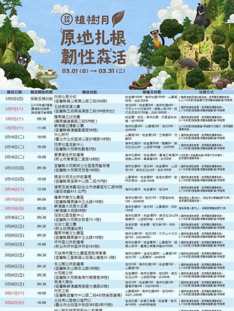 林保署宜蘭分署提醒大家,每場次贈苗樹種不同,請事先上網查詢就近領取。